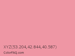 XYZ 53.204,42.844,40.587 Color is a light red color and the nearest color is Mauvelous #ef98aa. Hex code #ef96a4 and RGB value is rgb(239,150,164). In RGB color space, this color is composed of 94% red, 59% green, 64% blue, In CMYK color space, this color is composed of 0% cyan, 37% magenta, 31% yellow , 6% black , In HSL color space, this color has a hue angle of 351° , 74% saturation and 76% lightness.