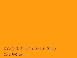 XYZ 53.215,45.071,6.347 Color is a normal orange color and the nearest color is West Side #ff910f. Hex code #ff9c0f and RGB value is rgb(255,156,15). In RGB color space, this color is composed of 100% red, 61% green, 6% blue, In CMYK color space, this color is composed of 0% cyan, 39% magenta, 94% yellow , 0% black , In HSL color space, this color has a hue angle of 35° , 100% saturation and 53% lightness.