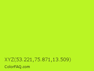 XYZ 53.221,75.871,13.509 Color is a normal lime color and the nearest color is Green Yellow #adff2f. Hex code #baf524 and RGB value is rgb(186,245,36). In RGB color space, this color is composed of 73% red, 96% green, 14% blue, In CMYK color space, this color is composed of 24% cyan, 0% magenta, 85% yellow , 4% black , In HSL color space, this color has a hue angle of 77° , 91% saturation and 55% lightness.