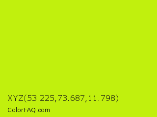 XYZ 53.225,73.687,11.798 Color is a normal lime color and the nearest color is Las Palmas #c6e610. Hex code #c1f00d and RGB value is rgb(193,240,13). In RGB color space, this color is composed of 76% red, 94% green, 5% blue, In CMYK color space, this color is composed of 20% cyan, 0% magenta, 95% yellow , 6% black , In HSL color space, this color has a hue angle of 72° , 90% saturation and 50% lightness.