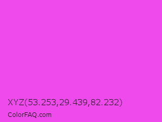 XYZ 53.253,29.439,82.232 Color is a light magenta color and the nearest color is Purple Pizzazz #fe4eda. Hex code #ef4bec and RGB value is rgb(239,75,236). In RGB color space, this color is composed of 94% red, 29% green, 93% blue, In CMYK color space, this color is composed of 0% cyan, 69% magenta, 1% yellow , 6% black , In HSL color space, this color has a hue angle of 301° , 84% saturation and 62% lightness.