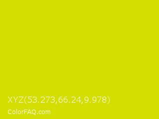 XYZ 53.273,66.24,9.978 Color is a normal yellow color and the nearest color is Bitter Lemon #cae00d. Hex code #d4de00 and RGB value is rgb(212,222,0). In RGB color space, this color is composed of 83% red, 87% green, 0% blue, In CMYK color space, this color is composed of 5% cyan, 0% magenta, 100% yellow , 13% black , In HSL color space, this color has a hue angle of 63° , 100% saturation and 44% lightness.