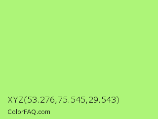 XYZ 53.276,75.545,29.543 Color is a light green color and the nearest color is Sulu #c1f07c. Hex code #adf578 and RGB value is rgb(173,245,120). In RGB color space, this color is composed of 68% red, 96% green, 47% blue, In CMYK color space, this color is composed of 29% cyan, 0% magenta, 51% yellow , 4% black , In HSL color space, this color has a hue angle of 95° , 86% saturation and 72% lightness.