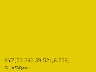 XYZ 53.282,59.521,8.738 Color is a normal yellow color and the nearest color is Citrine #e4d00a. Hex code #e3cc02 and RGB value is rgb(227,204,2). In RGB color space, this color is composed of 89% red, 80% green, 1% blue, In CMYK color space, this color is composed of 0% cyan, 10% magenta, 99% yellow , 11% black , In HSL color space, this color has a hue angle of 54° , 98% saturation and 45% lightness.