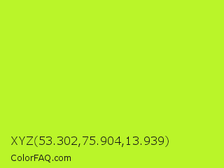 XYZ 53.302,75.904,13.939 Color is a normal lime color and the nearest color is Green Yellow #adff2f. Hex code #baf529 and RGB value is rgb(186,245,41). In RGB color space, this color is composed of 73% red, 96% green, 16% blue, In CMYK color space, this color is composed of 24% cyan, 0% magenta, 83% yellow , 4% black , In HSL color space, this color has a hue angle of 77° , 91% saturation and 56% lightness.
