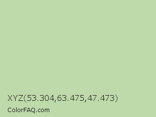 XYZ 53.304,63.475,47.473 Color is a light green color and the nearest color is Sprout #c1d7b0. Hex code #bed9aa and RGB value is rgb(190,217,170). In RGB color space, this color is composed of 75% red, 85% green, 67% blue, In CMYK color space, this color is composed of 12% cyan, 0% magenta, 22% yellow , 15% black , In HSL color space, this color has a hue angle of 94° , 38% saturation and 76% lightness.
