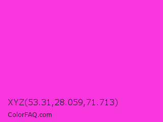 XYZ 53.31,28.059,71.713 Color is a normal magenta color and the nearest color is Razzle Dazzle Rose #ff33cc. Hex code #f838de and RGB value is rgb(248,56,222). In RGB color space, this color is composed of 97% red, 22% green, 87% blue, In CMYK color space, this color is composed of 0% cyan, 77% magenta, 10% yellow , 3% black , In HSL color space, this color has a hue angle of 308° , 93% saturation and 60% lightness.