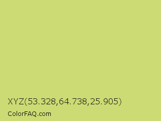XYZ 53.328,64.738,25.905 Color is a light yellow color and the nearest color is Yellow Green #c5e17a. Hex code #ccdb73 and RGB value is rgb(204,219,115). In RGB color space, this color is composed of 80% red, 86% green, 45% blue, In CMYK color space, this color is composed of 7% cyan, 0% magenta, 47% yellow , 14% black , In HSL color space, this color has a hue angle of 69° , 59% saturation and 65% lightness.