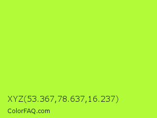 XYZ 53.367,78.637,16.237 Color is a normal green color and the nearest color is Green Yellow #adff2f. Hex code #b1fb39 and RGB value is rgb(177,251,57). In RGB color space, this color is composed of 69% red, 98% green, 22% blue, In CMYK color space, this color is composed of 29% cyan, 0% magenta, 77% yellow , 2% black , In HSL color space, this color has a hue angle of 83° , 96% saturation and 60% lightness.