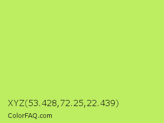 XYZ 53.428,72.25,22.439 Color is a light green color and the nearest color is Inchworm #b2ec5d. Hex code #bded61 and RGB value is rgb(189,237,97). In RGB color space, this color is composed of 74% red, 93% green, 38% blue, In CMYK color space, this color is composed of 20% cyan, 0% magenta, 59% yellow , 7% black , In HSL color space, this color has a hue angle of 81° , 80% saturation and 65% lightness.