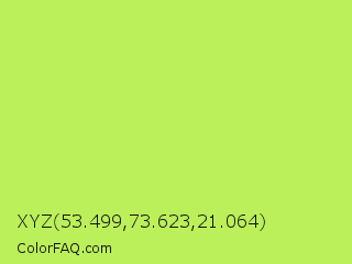 XYZ 53.499,73.623,21.064 Color is a light green color and the nearest color is Inchworm #b2ec5d. Hex code #bbf05a and RGB value is rgb(187,240,90). In RGB color space, this color is composed of 73% red, 94% green, 35% blue, In CMYK color space, this color is composed of 22% cyan, 0% magenta, 63% yellow , 6% black , In HSL color space, this color has a hue angle of 81° , 83% saturation and 65% lightness.