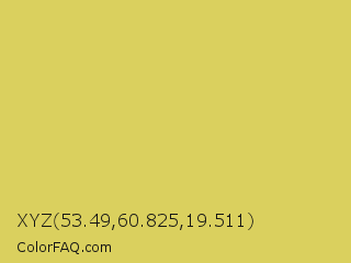 XYZ 53.49,60.825,19.511 Color is a light yellow color and the nearest color is Tacha #d6c562. Hex code #dad05e and RGB value is rgb(218,208,94). In RGB color space, this color is composed of 85% red, 82% green, 37% blue, In CMYK color space, this color is composed of 0% cyan, 5% magenta, 57% yellow , 15% black , In HSL color space, this color has a hue angle of 55° , 63% saturation and 61% lightness.
