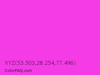 XYZ 53.503,28.254,77.496 Color is a normal magenta color and the nearest color is Purple Pizzazz #fe4eda. Hex code #f53be6 and RGB value is rgb(245,59,230). In RGB color space, this color is composed of 96% red, 23% green, 90% blue, In CMYK color space, this color is composed of 0% cyan, 76% magenta, 6% yellow , 4% black , In HSL color space, this color has a hue angle of 305° , 90% saturation and 60% lightness.