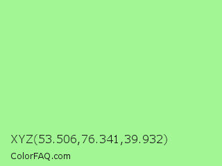 XYZ 53.506,76.341,39.932 Color is a light green color and the nearest color is Pale Green #98fb98. Hex code #a2f794 and RGB value is rgb(162,247,148). In RGB color space, this color is composed of 64% red, 97% green, 58% blue, In CMYK color space, this color is composed of 34% cyan, 0% magenta, 40% yellow , 3% black , In HSL color space, this color has a hue angle of 112° , 86% saturation and 77% lightness.