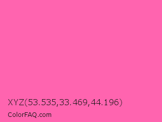 XYZ 53.535,33.469,44.196 Color is a light rose color and the nearest color is Hot Pink #ff69b4. Hex code #ff64af and RGB value is rgb(255,100,175). In RGB color space, this color is composed of 100% red, 39% green, 69% blue, In CMYK color space, this color is composed of 0% cyan, 61% magenta, 31% yellow , 0% black , In HSL color space, this color has a hue angle of 331° , 100% saturation and 70% lightness.