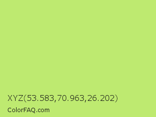 XYZ 53.583,70.963,26.202 Color is a light green color and the nearest color is Sulu #c1f07c. Hex code #beea70 and RGB value is rgb(190,234,112). In RGB color space, this color is composed of 75% red, 92% green, 44% blue, In CMYK color space, this color is composed of 19% cyan, 0% magenta, 52% yellow , 8% black , In HSL color space, this color has a hue angle of 82° , 74% saturation and 68% lightness.