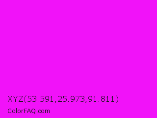 XYZ 53.591,25.973,91.811 Color is a normal magenta color and the nearest color is Magenta / Fuchsia #ff00ff. Hex code #f112f9 and RGB value is rgb(241,18,249). In RGB color space, this color is composed of 95% red, 7% green, 98% blue, In CMYK color space, this color is composed of 3% cyan, 93% magenta, 0% yellow , 2% black , In HSL color space, this color has a hue angle of 298° , 95% saturation and 52% lightness.