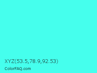 XYZ 53.5,78.9,92.53 Color is a light cyan color and the nearest color is Turquoise #40e0d0. Hex code #45ffed and RGB value is rgb(69,255,237). In RGB color space, this color is composed of 27% red, 100% green, 93% blue, In CMYK color space, this color is composed of 73% cyan, 0% magenta, 7% yellow , 0% black , In HSL color space, this color has a hue angle of 174° , 100% saturation and 64% lightness.