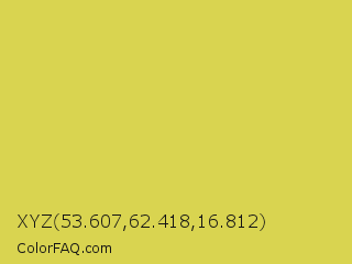 XYZ 53.607,62.418,16.812 Color is a normal yellow color and the nearest color is Wattle #dcd747. Hex code #d9d450 and RGB value is rgb(217,212,80). In RGB color space, this color is composed of 85% red, 83% green, 31% blue, In CMYK color space, this color is composed of 0% cyan, 2% magenta, 63% yellow , 15% black , In HSL color space, this color has a hue angle of 58° , 64% saturation and 58% lightness.