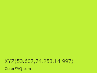 XYZ 53.607,74.253,14.997 Color is a normal lime color and the nearest color is Green Yellow #adff2f. Hex code #bff136 and RGB value is rgb(191,241,54). In RGB color space, this color is composed of 75% red, 95% green, 21% blue, In CMYK color space, this color is composed of 21% cyan, 0% magenta, 78% yellow , 5% black , In HSL color space, this color has a hue angle of 76° , 87% saturation and 58% lightness.