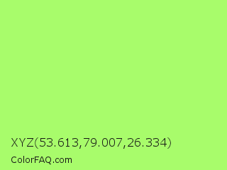 XYZ 53.613,79.007,26.334 Color is a light green color and the nearest color is Inchworm #b2ec5d. Hex code #a8fc6b and RGB value is rgb(168,252,107). In RGB color space, this color is composed of 66% red, 99% green, 42% blue, In CMYK color space, this color is composed of 33% cyan, 0% magenta, 58% yellow , 1% black , In HSL color space, this color has a hue angle of 95° , 96% saturation and 70% lightness.