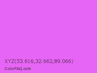 XYZ 53.616,32.662,89.066 Color is a light magenta color and the nearest color is Heliotrope #df73ff. Hex code #e665f4 and RGB value is rgb(230,101,244). In RGB color space, this color is composed of 90% red, 40% green, 96% blue, In CMYK color space, this color is composed of 6% cyan, 59% magenta, 0% yellow , 4% black , In HSL color space, this color has a hue angle of 294° , 87% saturation and 68% lightness.
