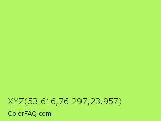 XYZ 53.616,76.297,23.957 Color is a light green color and the nearest color is Inchworm #b2ec5d. Hex code #b2f664 and RGB value is rgb(178,246,100). In RGB color space, this color is composed of 70% red, 96% green, 39% blue, In CMYK color space, this color is composed of 28% cyan, 0% magenta, 59% yellow , 4% black , In HSL color space, this color has a hue angle of 88° , 89% saturation and 68% lightness.