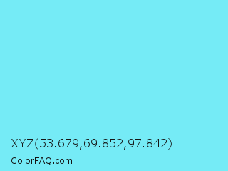 XYZ 53.679,69.852,97.842 Color is a light cyan color and the nearest color is Spray #79deec. Hex code #75ebf6 and RGB value is rgb(117,235,246). In RGB color space, this color is composed of 46% red, 92% green, 96% blue, In CMYK color space, this color is composed of 52% cyan, 4% magenta, 0% yellow , 4% black , In HSL color space, this color has a hue angle of 185° , 88% saturation and 71% lightness.
