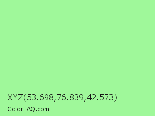 XYZ 53.698,76.839,42.573 Color is a light green color and the nearest color is Pale Green #98fb98. Hex code #9ff89a and RGB value is rgb(159,248,154). In RGB color space, this color is composed of 62% red, 97% green, 60% blue, In CMYK color space, this color is composed of 36% cyan, 0% magenta, 38% yellow , 3% black , In HSL color space, this color has a hue angle of 117° , 87% saturation and 79% lightness.