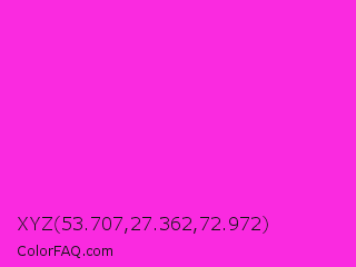 XYZ 53.707,27.362,72.972 Color is a normal magenta color and the nearest color is Razzle Dazzle Rose #ff33cc. Hex code #fa2ae0 and RGB value is rgb(250,42,224). In RGB color space, this color is composed of 98% red, 16% green, 88% blue, In CMYK color space, this color is composed of 0% cyan, 83% magenta, 10% yellow , 2% black , In HSL color space, this color has a hue angle of 308° , 95% saturation and 57% lightness.