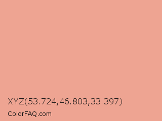 XYZ 53.724,46.803,33.397 Color is a light red color and the nearest color is Tonys Pink #e79f8c. Hex code #eea492 and RGB value is rgb(238,164,146). In RGB color space, this color is composed of 93% red, 64% green, 57% blue, In CMYK color space, this color is composed of 0% cyan, 31% magenta, 39% yellow , 7% black , In HSL color space, this color has a hue angle of 12° , 73% saturation and 75% lightness.