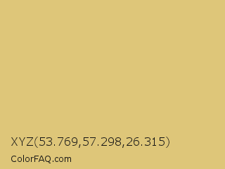 XYZ 53.769,57.298,26.315 Color is a light yellow color and the nearest color is Chenin #dfcd6f. Hex code #dec679 and RGB value is rgb(222,198,121). In RGB color space, this color is composed of 87% red, 78% green, 47% blue, In CMYK color space, this color is composed of 0% cyan, 11% magenta, 45% yellow , 13% black , In HSL color space, this color has a hue angle of 46° , 60% saturation and 67% lightness.