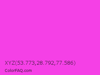 XYZ 53.773,28.792,77.586 Color is a light magenta color and the nearest color is Purple Pizzazz #fe4eda. Hex code #f540e6 and RGB value is rgb(245,64,230). In RGB color space, this color is composed of 96% red, 25% green, 90% blue, In CMYK color space, this color is composed of 0% cyan, 74% magenta, 6% yellow , 4% black , In HSL color space, this color has a hue angle of 305° , 90% saturation and 61% lightness.