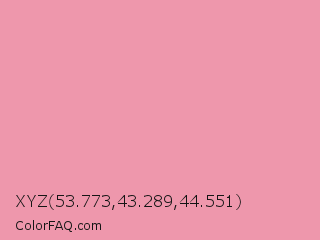 XYZ 53.773,43.289,44.551 Color is a light red color and the nearest color is Mauvelous #ef98aa. Hex code #ee97ac and RGB value is rgb(238,151,172). In RGB color space, this color is composed of 93% red, 59% green, 67% blue, In CMYK color space, this color is composed of 0% cyan, 37% magenta, 28% yellow , 7% black , In HSL color space, this color has a hue angle of 346° , 72% saturation and 76% lightness.