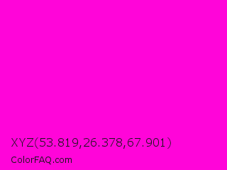 XYZ 53.819,26.378,67.901 Color is a normal magenta color and the nearest color is Purple Pizzazz #ff00cc. Hex code #ff05d9 and RGB value is rgb(255,5,217). In RGB color space, this color is composed of 100% red, 2% green, 85% blue, In CMYK color space, this color is composed of 0% cyan, 98% magenta, 15% yellow , 0% black , In HSL color space, this color has a hue angle of 309° , 100% saturation and 51% lightness.