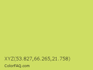 XYZ 53.827,66.265,21.758 Color is a light yellow color and the nearest color is Booger Buster #dde26a. Hex code #cede63 and RGB value is rgb(206,222,99). In RGB color space, this color is composed of 81% red, 87% green, 39% blue, In CMYK color space, this color is composed of 7% cyan, 0% magenta, 55% yellow , 13% black , In HSL color space, this color has a hue angle of 68° , 65% saturation and 63% lightness.