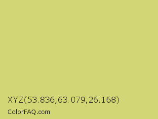 XYZ 53.836,63.079,26.168 Color is a light yellow color and the nearest color is Chenin #dfcd6f. Hex code #d2d675 and RGB value is rgb(210,214,117). In RGB color space, this color is composed of 82% red, 84% green, 46% blue, In CMYK color space, this color is composed of 2% cyan, 0% magenta, 45% yellow , 16% black , In HSL color space, this color has a hue angle of 62° , 54% saturation and 65% lightness.