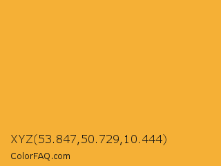 XYZ 53.847,50.729,10.444 Color is a normal orange color and the nearest color is Tulip Tree #eab33b. Hex code #f5b036 and RGB value is rgb(245,176,54). In RGB color space, this color is composed of 96% red, 69% green, 21% blue, In CMYK color space, this color is composed of 0% cyan, 28% magenta, 78% yellow , 4% black , In HSL color space, this color has a hue angle of 38° , 91% saturation and 59% lightness.