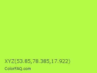 XYZ 53.85,78.385,17.922 Color is a light green color and the nearest color is Green Lizard #a7f432. Hex code #b3fa45 and RGB value is rgb(179,250,69). In RGB color space, this color is composed of 70% red, 98% green, 27% blue, In CMYK color space, this color is composed of 28% cyan, 0% magenta, 72% yellow , 2% black , In HSL color space, this color has a hue angle of 84° , 95% saturation and 63% lightness.