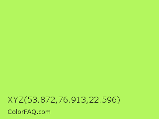 XYZ 53.872,76.913,22.596 Color is a light green color and the nearest color is Inchworm #b2ec5d. Hex code #b3f75e and RGB value is rgb(179,247,94). In RGB color space, this color is composed of 70% red, 97% green, 37% blue, In CMYK color space, this color is composed of 28% cyan, 0% magenta, 62% yellow , 3% black , In HSL color space, this color has a hue angle of 87° , 91% saturation and 67% lightness.