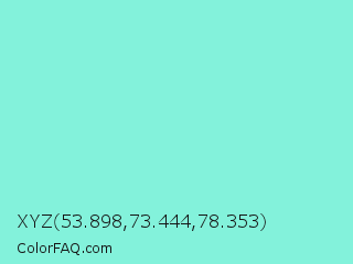 XYZ 53.898,73.444,78.353 Color is a light cyan color and the nearest color is Riptide #8be6d8. Hex code #83f2db and RGB value is rgb(131,242,219). In RGB color space, this color is composed of 51% red, 95% green, 86% blue, In CMYK color space, this color is composed of 46% cyan, 0% magenta, 10% yellow , 5% black , In HSL color space, this color has a hue angle of 168° , 81% saturation and 73% lightness.