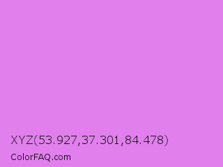 XYZ 53.927,37.301,84.478 Color is a light magenta color and the nearest color is Lavender Magenta #ee82ee. Hex code #e17fed and RGB value is rgb(225,127,237). In RGB color space, this color is composed of 88% red, 50% green, 93% blue, In CMYK color space, this color is composed of 5% cyan, 46% magenta, 0% yellow , 7% black , In HSL color space, this color has a hue angle of 293° , 75% saturation and 71% lightness.
