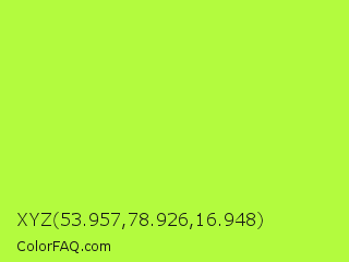 XYZ 53.957,78.926,16.948 Color is a light green color and the nearest color is Green Yellow #adff2f. Hex code #b3fb3e and RGB value is rgb(179,251,62). In RGB color space, this color is composed of 70% red, 98% green, 24% blue, In CMYK color space, this color is composed of 29% cyan, 0% magenta, 75% yellow , 2% black , In HSL color space, this color has a hue angle of 83° , 96% saturation and 61% lightness.