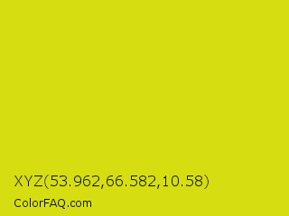 XYZ 53.962,66.582,10.58 Color is a normal yellow color and the nearest color is Barberry #ded717. Hex code #d6de12 and RGB value is rgb(214,222,18). In RGB color space, this color is composed of 84% red, 87% green, 7% blue, In CMYK color space, this color is composed of 4% cyan, 0% magenta, 92% yellow , 13% black , In HSL color space, this color has a hue angle of 62° , 85% saturation and 47% lightness.