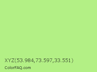 XYZ 53.984,73.597,33.551 Color is a light green color and the nearest color is Sulu #c1f07c. Hex code #b3f085 and RGB value is rgb(179,240,133). In RGB color space, this color is composed of 70% red, 94% green, 52% blue, In CMYK color space, this color is composed of 25% cyan, 0% magenta, 45% yellow , 6% black , In HSL color space, this color has a hue angle of 94° , 78% saturation and 73% lightness.