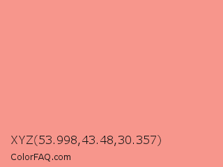 XYZ 53.998,43.48,30.357 Color is a light red color and the nearest color is Vivid Tangerine #ffa089. Hex code #f7968c and RGB value is rgb(247,150,140). In RGB color space, this color is composed of 97% red, 59% green, 55% blue, In CMYK color space, this color is composed of 0% cyan, 39% magenta, 43% yellow , 3% black , In HSL color space, this color has a hue angle of 6° , 87% saturation and 76% lightness.