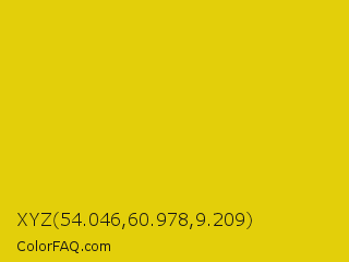 XYZ 54.046,60.978,9.209 Color is a normal yellow color and the nearest color is Citrine #e4d00a. Hex code #e3cf0a and RGB value is rgb(227,207,10). In RGB color space, this color is composed of 89% red, 81% green, 4% blue, In CMYK color space, this color is composed of 0% cyan, 9% magenta, 96% yellow , 11% black , In HSL color space, this color has a hue angle of 54° , 92% saturation and 46% lightness.