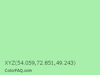 XYZ 54.059,72.851,49.243 Color is a light green color and the nearest color is Granny Smith Apple #a8e4a0. Hex code #a7efaa and RGB value is rgb(167,239,170). In RGB color space, this color is composed of 65% red, 94% green, 67% blue, In CMYK color space, this color is composed of 30% cyan, 0% magenta, 29% yellow , 6% black , In HSL color space, this color has a hue angle of 123° , 69% saturation and 80% lightness.