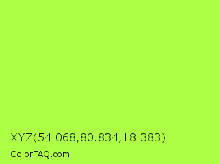XYZ 54.068,80.834,18.383 Color is a light green color and the nearest color is French Lime #9efd38. Hex code #adff45 and RGB value is rgb(173,255,69). In RGB color space, this color is composed of 68% red, 100% green, 27% blue, In CMYK color space, this color is composed of 32% cyan, 0% magenta, 73% yellow , 0% black , In HSL color space, this color has a hue angle of 86° , 100% saturation and 64% lightness.