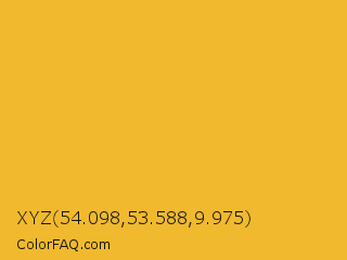 XYZ 54.098,53.588,9.975 Color is a normal orange color and the nearest color is Saffron #f4c430. Hex code #f1b92d and RGB value is rgb(241,185,45). In RGB color space, this color is composed of 95% red, 73% green, 18% blue, In CMYK color space, this color is composed of 0% cyan, 23% magenta, 81% yellow , 5% black , In HSL color space, this color has a hue angle of 43° , 88% saturation and 56% lightness.